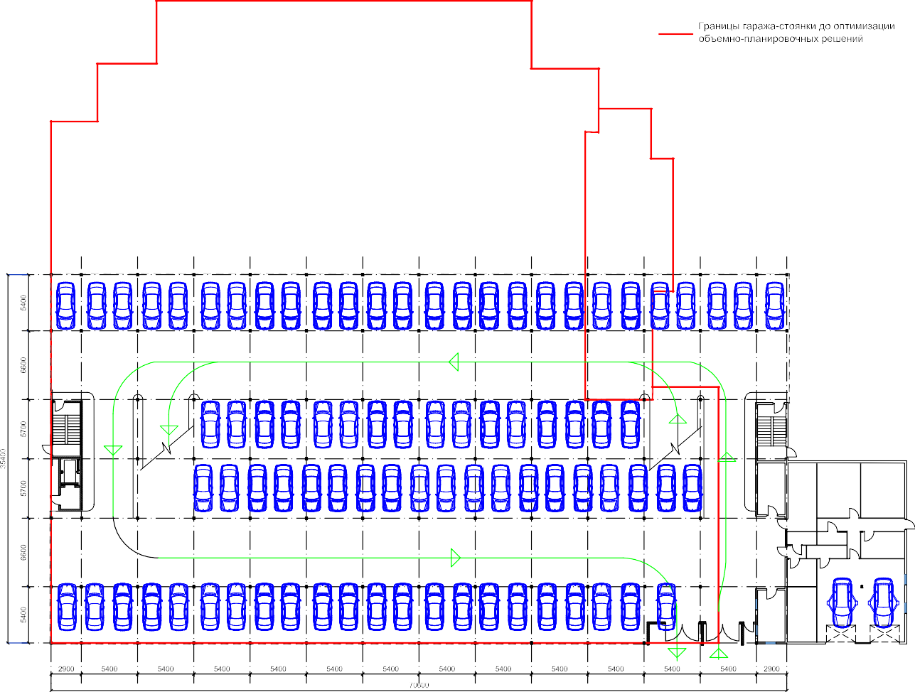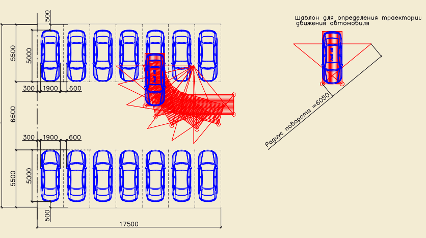Алгоритм поиска наиболее экономически целесообразного решения по рампе можно свести к следующему: поставить несколько пролетов рядом или расставить машино-места по площадке с максимальным заполнением площади, как на плоскостной стоянке (назовем это «плоскостным решением»), с необходимыми проездами между рядами и вдоль них; затем, накладывая на эту планировку различные схемы рампы с учетом высотных отметок межэтажных перекрытий, подобрать такой тип рампы, который исключал бы как можно меньше машино-мест.