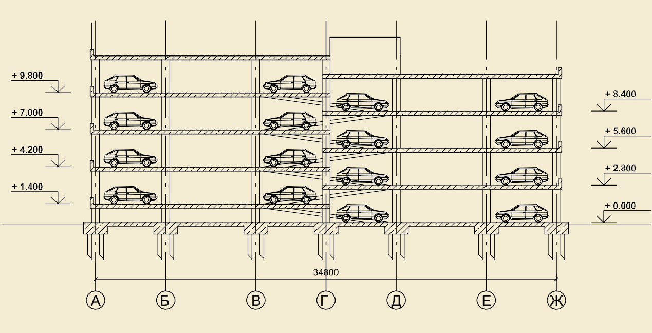 Благодаря применению полурамповой компоновки здания на стальном каркасе удалось разместить необходимое количество машино-мест на надземных этажах и эксплуатируемой кровле, избавившись от подземных этажей.