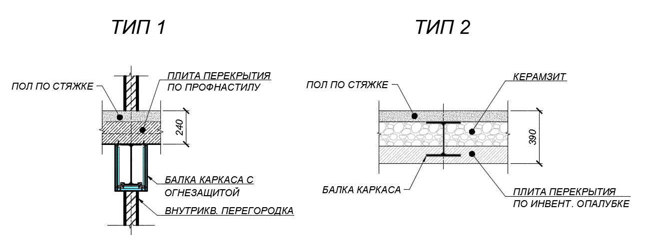 В таблице приведены показатели, необходимые для сравнения стального каркаса с альтернативными технологиями, например, с монолитным каркасом. Подобное сравнение справедливо, если затраты на устройство плоской монолитной железобетонной плиты противопоставляются затратам на устройство конструкций перекрытия со стальным каркасом с учётом огнезащиты, натяжного потолка (если перекрытие выполняется по типу 1), керамзита и стяжки (если перекрытие выполняется по типу 2).