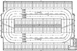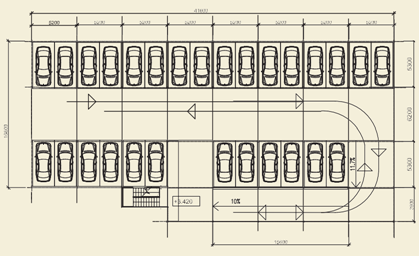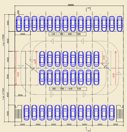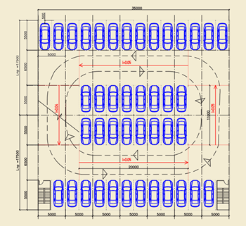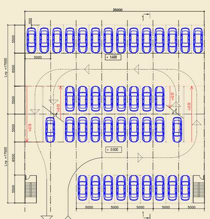 При строительстве общественных (не специализированных) автостоянок ширина пролета обычно составляет 16 500–18 000 мм. Алгоритм поиска наиболее экономически целесообразного решения по рампе можно свести к следующему: поставить несколько пролетов рядом или расставить машино-места по площадке с максимальным заполнением площади, как на плоскостной стоянке (назовем это «плоскостным решением»), с необходимыми проездами между рядами и вдоль них; затем, накладывая на эту планировку различные схемы рампы с учетом высотных отметок межэтажных перекрытий, подобрать такой тип рампы, который исключал бы как можно меньше машино-мест.