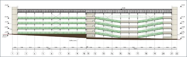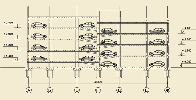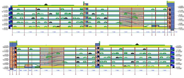 э от длины пятиэтажного гаража-стоянки с наклонными перекрытиями или полурамповой схемы: