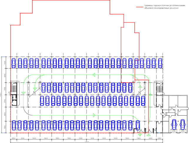 Вывод: Наиболее экономически эффективным решением является гараж-стоянка открытого типа с наклонными перекрытиями или с полуэтажной (полурамповой) схемой высотой до 6 этажей с площадью этажа до 2000 м² (в плане шириной 35 м и длиной от 35 до 55 м, с количеством машино-мест до 440). В качестве примера оптимизации проектных решений приведена 4-этажная отдельно стоящая закрытая гараж-стоянка на 440 машино-мест с двумя подземными этажами и с мойкой легковых автомобилей, расположенная в Новой Москве.