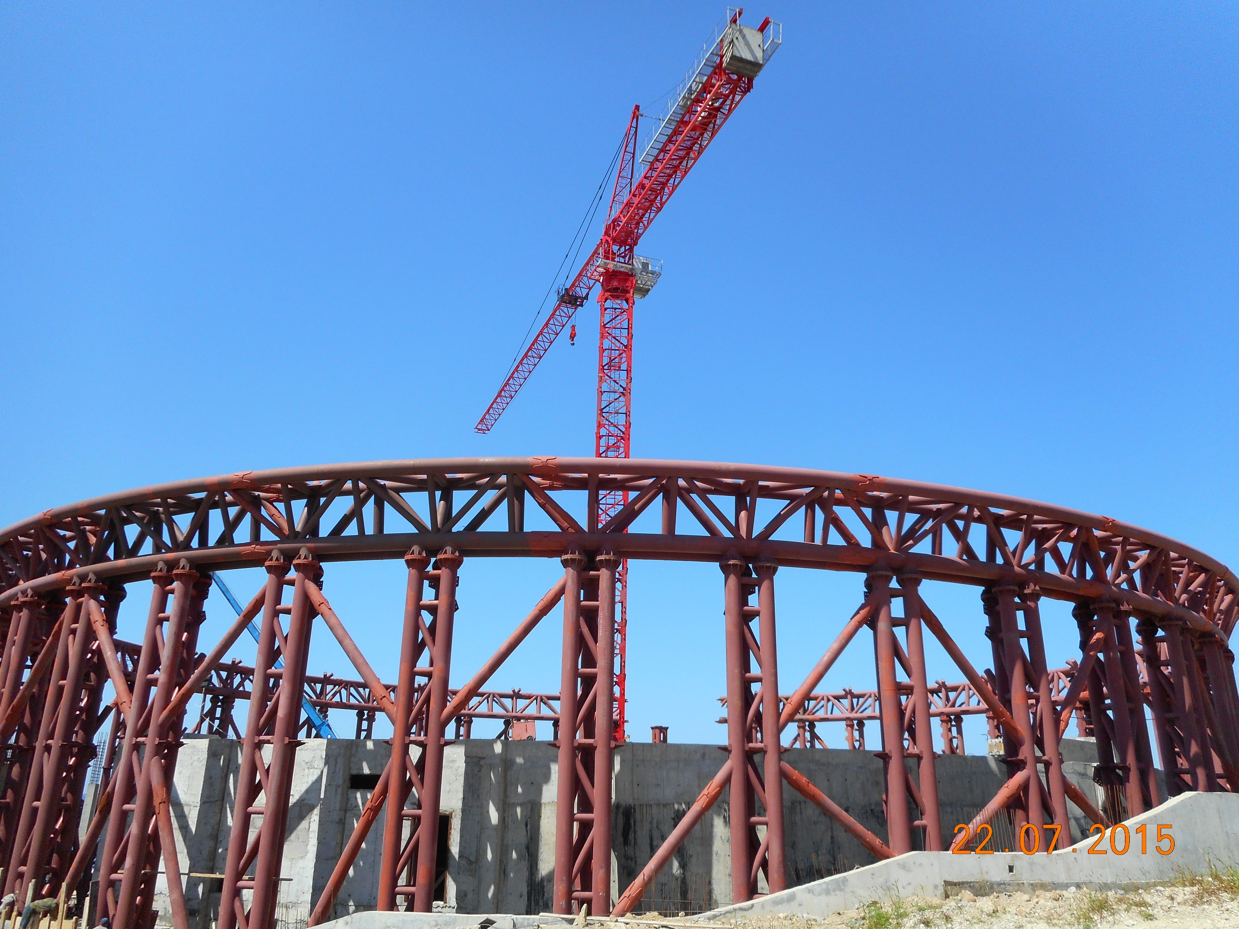 Купол опирается на систему трехветвевых колонн (44 шт.). Ветви колонн выполнены их труб ø426 × 28 мм, объединенных системой горизонтальных связей из труб 180х10. Для обеспечения геометрической неизменяемости стержневая структура оперта на пространственную кольцевую ферму высокой жесткости (нижнее опорное кольцо), призванную воспринимать в максимальной степени распор, не передавая его на колонны. Данная ферма, совместно с площадками в уровне ее низа, играет роль верхнего диска жесткости, перераспределяя передаваемые на колонны усилия от свода. Опирание купола на колонны осуществляется через опорное кольцо. Монтажный стык колонн с опорным кольцом выполнен на фланцах и усилен ребрами жесткости.