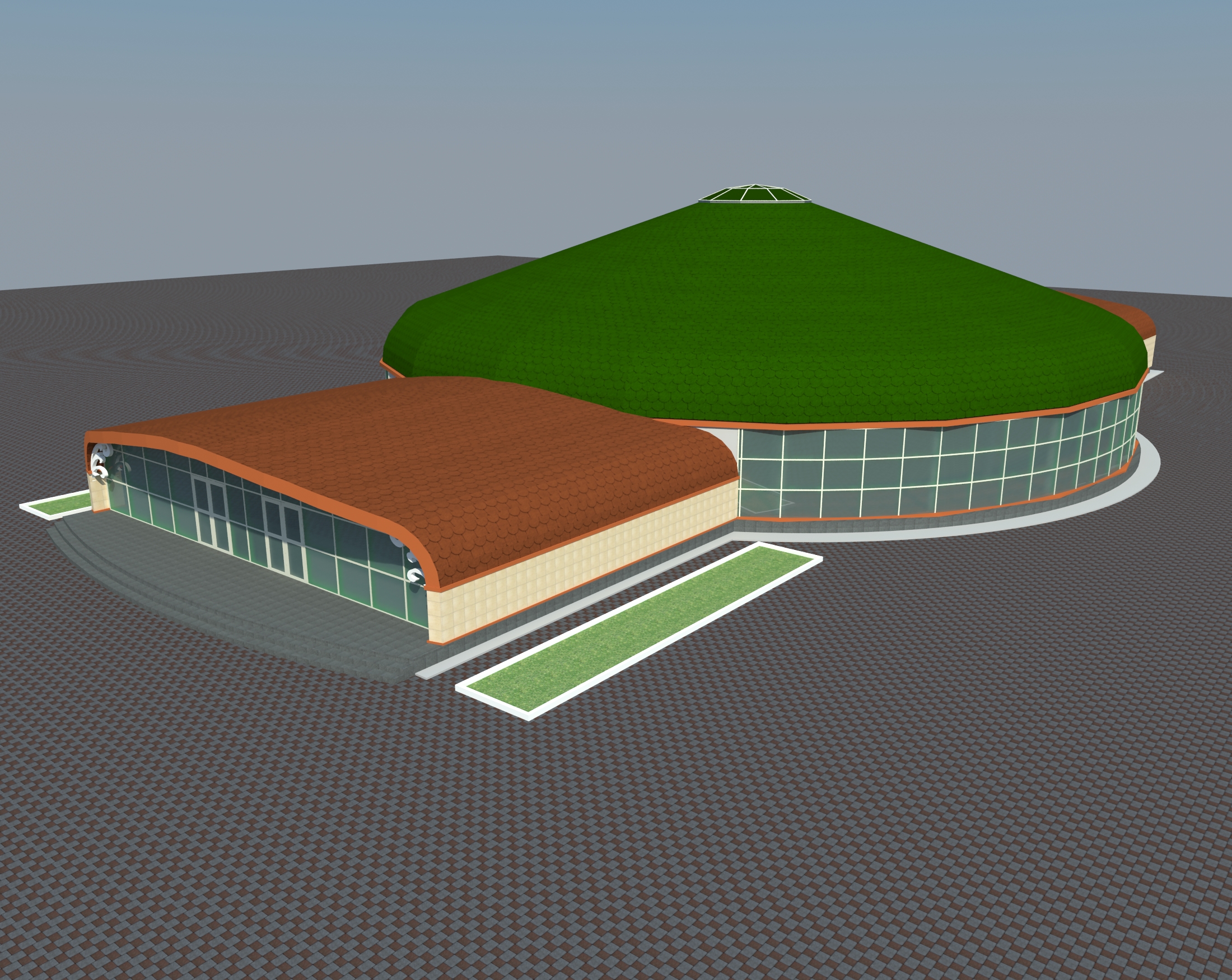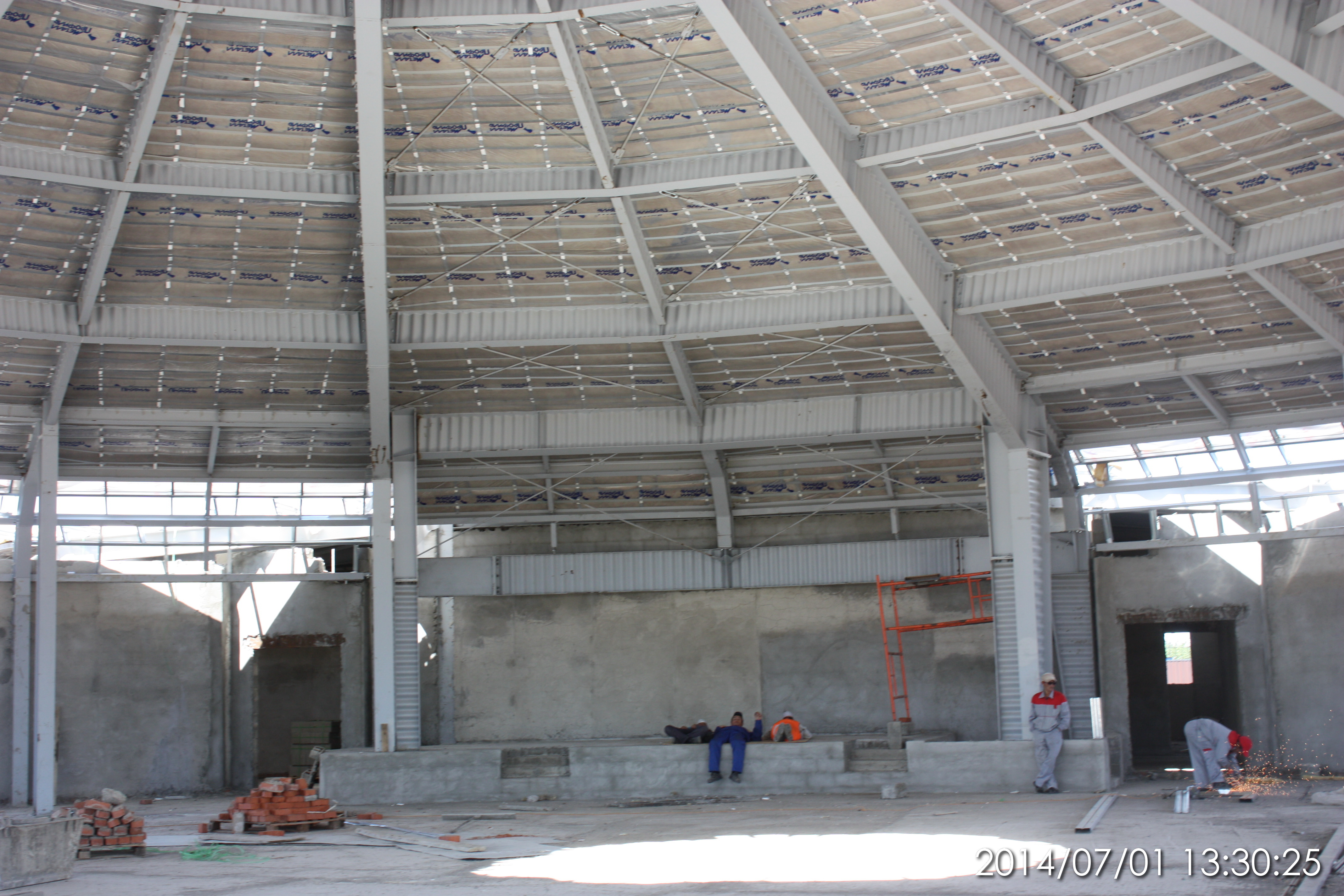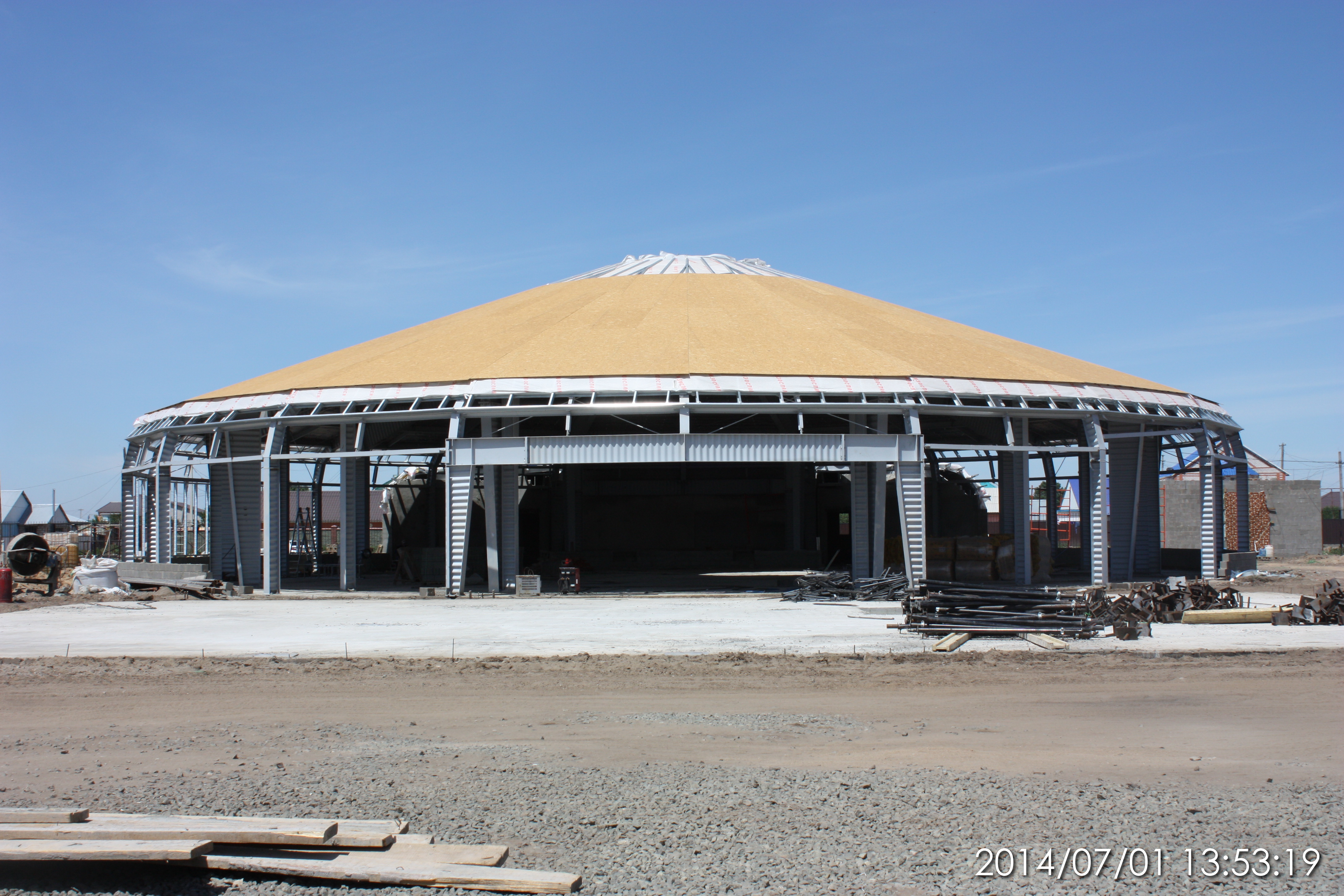 Выразительное архитектурно-художественное здание, построенное в национальном стиле кочевых народов Казахстана. Диаметр купола 36 м. Впервые в Казахстане были применены рамные конструкции из SIN-балок переменного сечения. Рациональное проектирование и использование SIN-балки в рамах и прогонах, а также предварительно-напряженные гибкие связи позволили уменьшить расход стали более чем в 2 раза по сравнению с проектом, выполненным в традиционных решетчатых конструкциях.