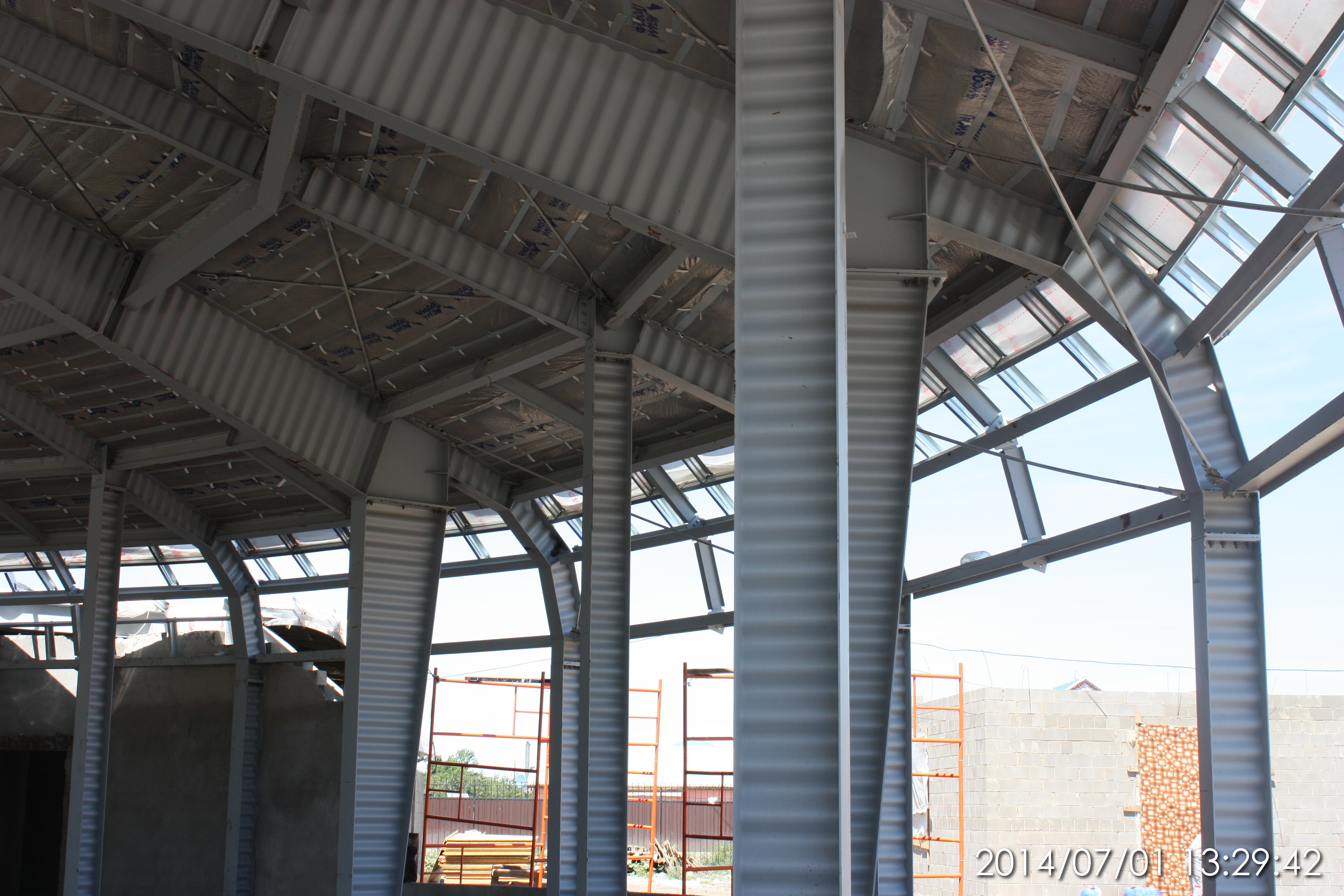 Каркас здания выполнен по рамной схеме, образующих купол. Устойчивость каркаса обеспечивается связевой системой, образующей жесткий диск покрытия. Соединение колонн с фундаментами - шарнирное. Аналогичный проект, разработанный на основании данного проекта для сейсмических районов, предполагает жесткое опирание стоек на фундаменты. При этом использование SIN-балки для сейсмических районов обеспечивает не только облегчение каркаса, что уменьшает сейсмические нагрузки, но и обеспечивает более надежную сейсмобезопасность каркаса. Гофрирование стенки исключает возможность потери местной устойчивости стенки при запроектных сейсмических нагрузках в рамах и балках. При этом такие конструкции могут служить надежными энергопоглощающими элементами.