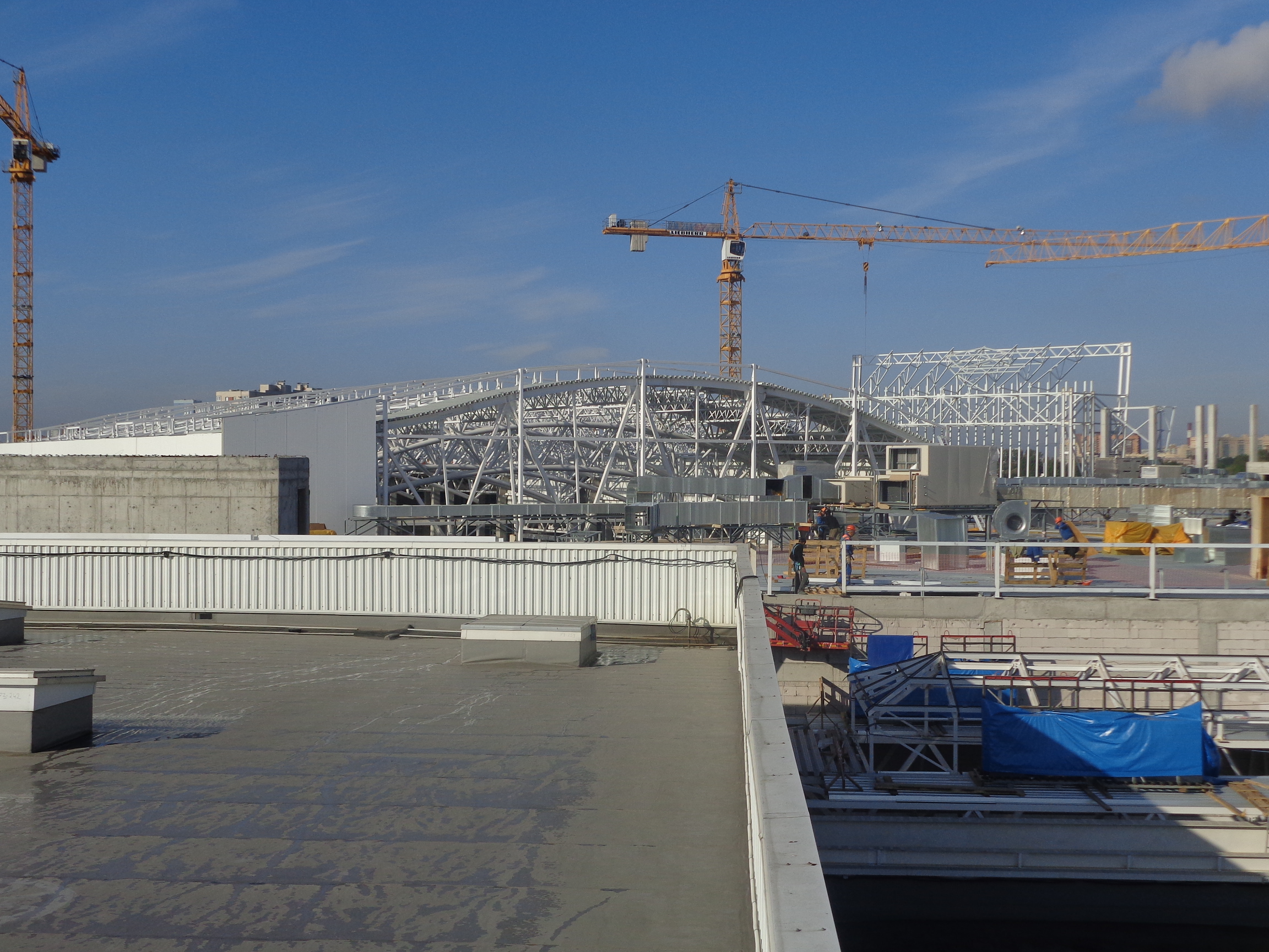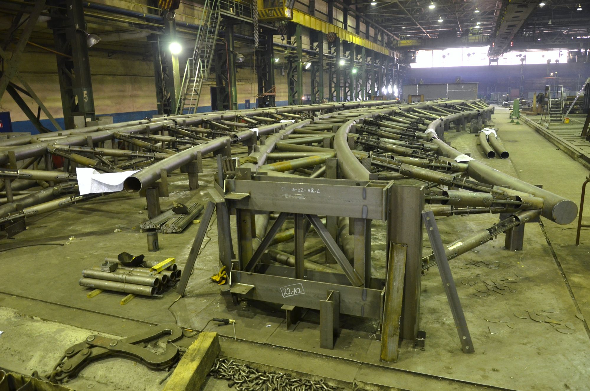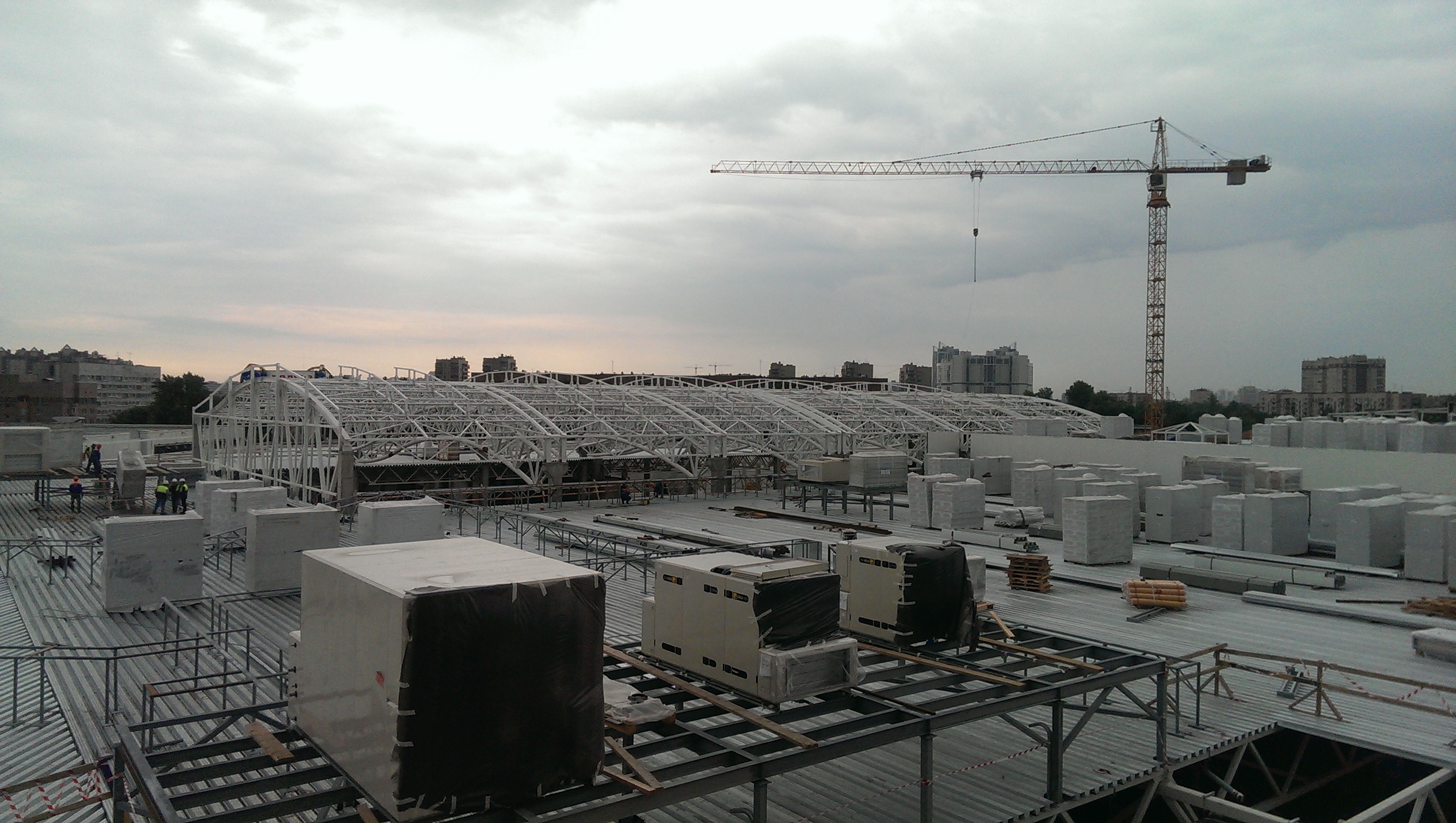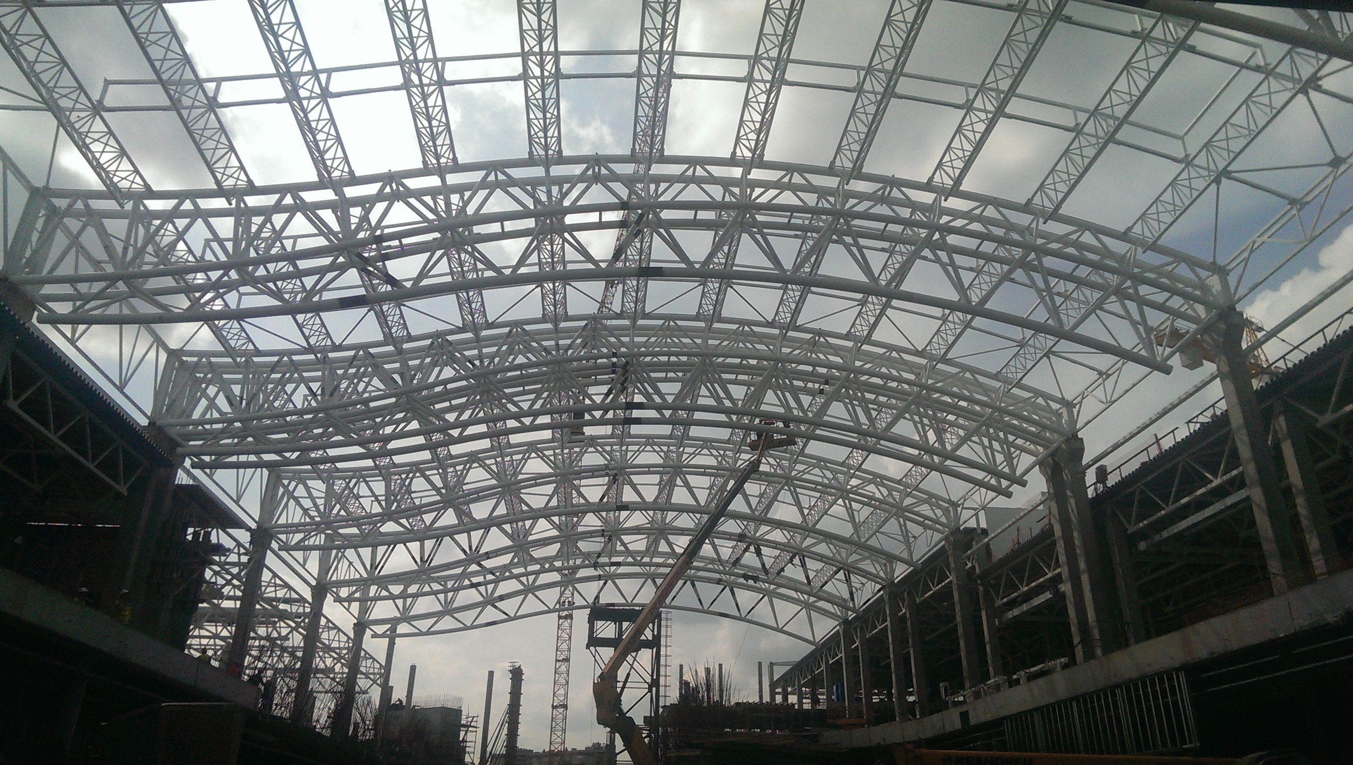 Колонны здания выполнены из железобетона. Плоские фермы и связи покрытия запроектированы из замкнутых гнутосварных квадратных и прямоугольных профилей. Пространственные фермы и прогоны запроектированы из электросварных круглых труб. Балки из прокатных профилей.